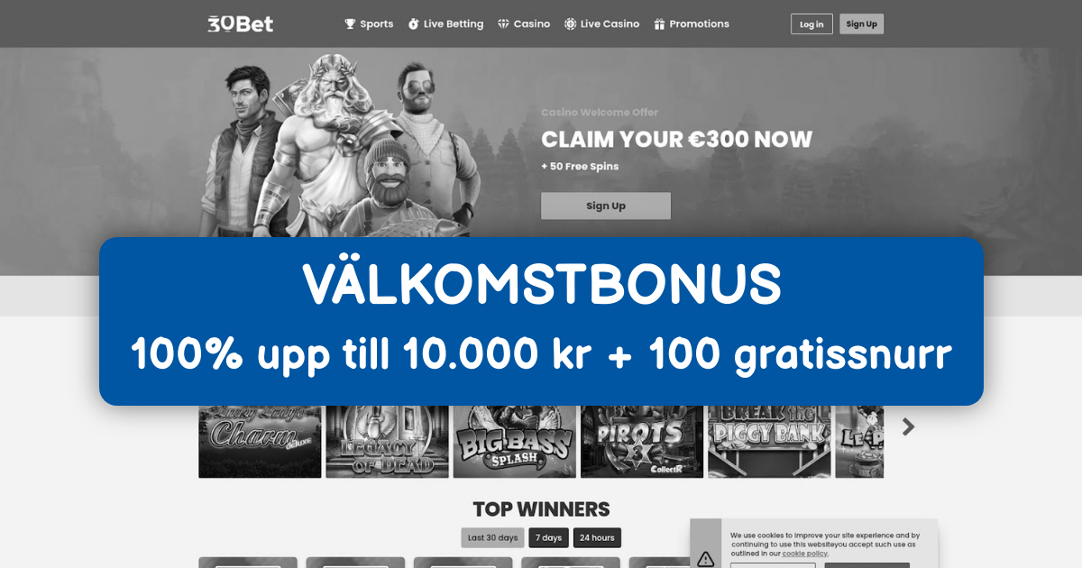30Bet Casino välkomnar dig till en värld av spännande spelupplevelser i Sverige. Som ny spelare kan du ta del av vår generösa välkomstbonus på 100% upp till 3000 kr, med rimliga omsättningskrav på 35x. Vi är licensierade av Spelinspektionen, vilket garanterar en säker och rättvis spel miljö för alla svenska spelare. Njut av fördelar som blixtsnabba uttag via Swish och andra populära metoder, samt 24/7 kundsupport på svenska. Vårt breda utbud inkluderar tusentals slots, engagerande live casino och klassiska bordspel som blackjack och roulette. Upplev live casino bonus med dealers i realtid, jackpot slots som kan förändra ditt liv, och snabb utbetalning för dina vinster. Vi samarbetar med ledande leverantörer som NetEnt, Pragmatic Play och Evolution för högkvalitativ underhållning. Allt är optimerat för mobil, så du kan spela vart du än är med vår smidiga app eller webbläsare. Insättningar är enkla med alternativ som Visa, Mastercard, Trustly och Swish, medan uttag hanteras snabbt och säkert. Kom igång på 30Bet Casino i Sverige och låt äventyret börja!